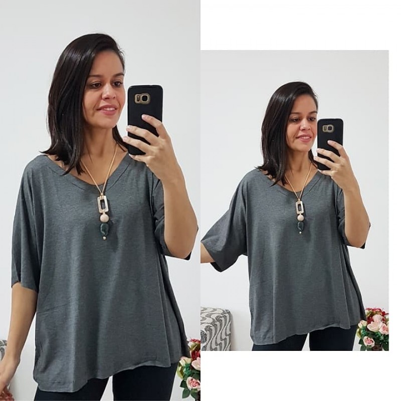 BenefÃcios: É uma peça versátil que toda mulher precisa ter em seu guarda roupa, com a Blusa ampla manga curta, em tecido viscolycra corte reto e gola V , você consegue compor diversos looks desde um look causal a um look mais formal.